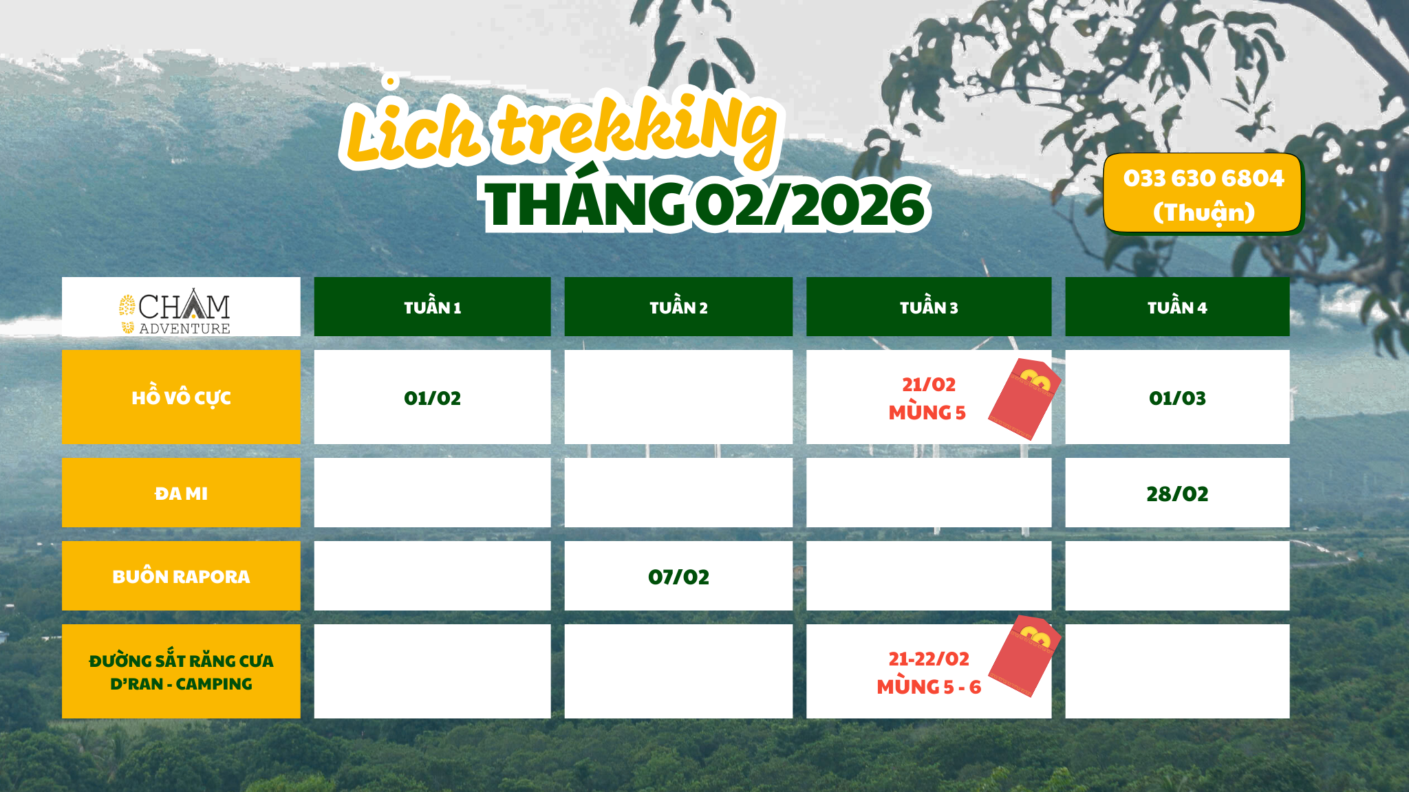 Từ hồ núi nguyên sinh đến sa mạc Hòa Thắng, từ rừng thông Đà Lạt đến cung đường sắt D’ran lịch sử, Chạm Adventure thiết kế những hành trình trekking độc bản – nơi mỗi chuyến đi không chỉ là khám phá, mà còn là trải nghiệm vừa gần gũi vừa mới lạ Chạm mang đến cho mọi người.