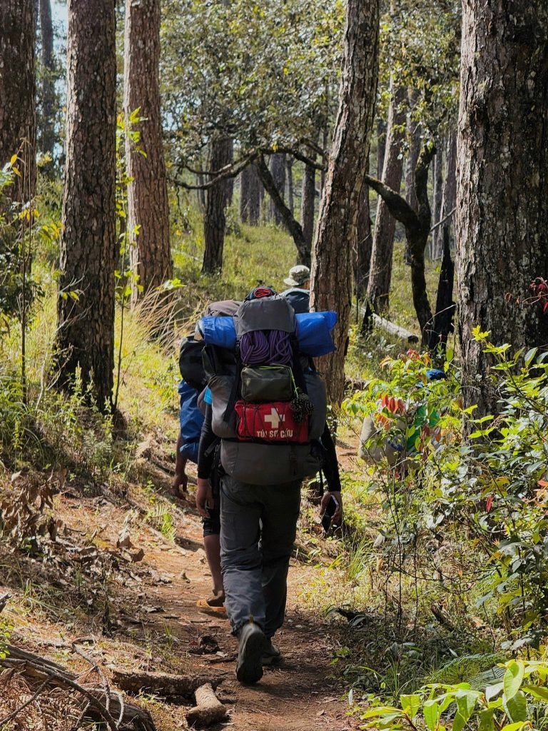 Trekking rừng thông Đà Lạt cùng Chạm Adventure không hướng đến trải nghiệm du lịch thông thường. Đây là một hành trình dài ngày, nơi thể lực, sự kiên nhẫn và tinh thần đồng đội đều được thử thách. Trong ba ngày hai đêm, người đi sẽ di chuyển liên tục qua các khu rừng thông cổ thụ, địa hình chủ yếu là đường mòn tự nhiên, dốc thoải xen kẽ những đoạn leo dài vừa đủ để thử sức. Nhịp đi được giữ ổn định, không quá nhanh nhưng cũng không ngắt quãng, giúp cơ thể thích nghi dần với cường độ vận động.